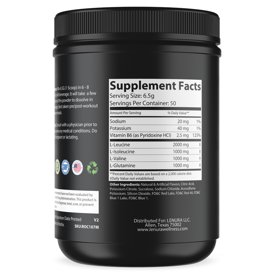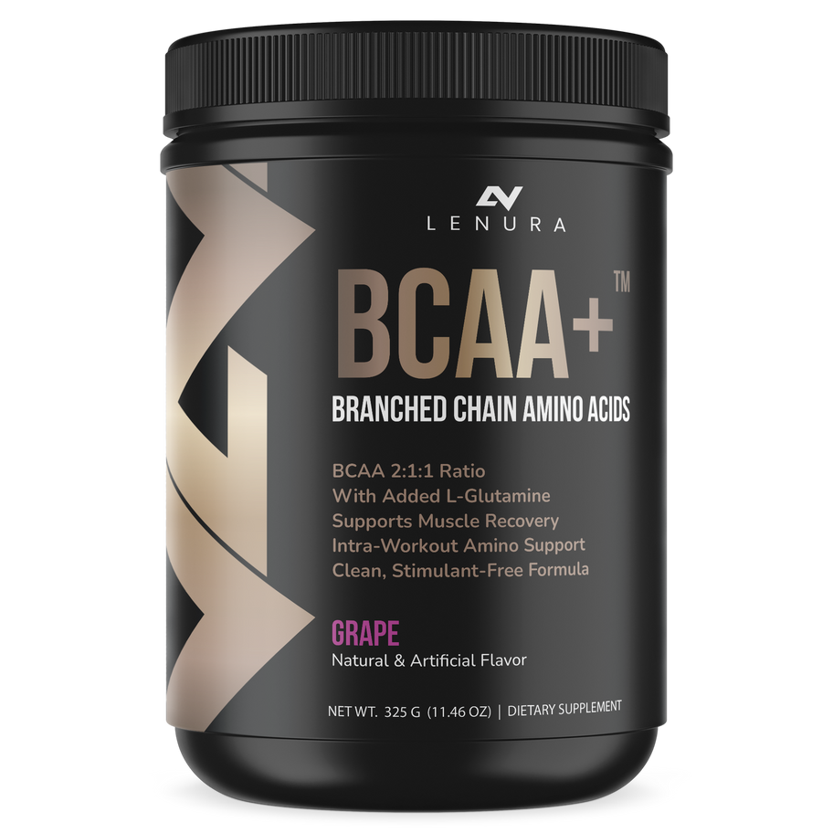 Lenura BCAA, Grape delivers essential branched-chain amino acids in a clean, effective formula designed for training and recovery. With a classic 2:1:1 ratio, added glutamine, and light electrolyte support, this premium amino blend supports endurance, hydration, and muscle recovery without stimulants or excess.