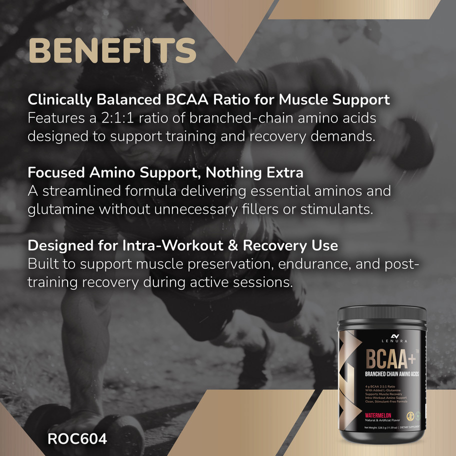 Lenura BCAA, Watermelon delivers essential branched-chain amino acids in a clean, focused formula designed for training and recovery. With a proven 2:1:1 ratio and added glutamine, this premium amino blend supports muscle endurance, recovery, and performance, without stimulants or excess.